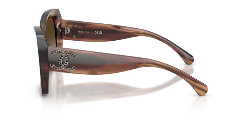 A CC Monogram in chain is hand screwed on the transparent acetate temples, through which you see a custom corewire.